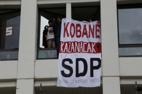 Bir grup Sosyalist Demokrasi Partisi (SDP) üyesi, Kobani'ye dikkat çekmek amacıyla Al Jazeera Türk'ün Ankara'daki bürosunu işgal ederek, pencereden 'Kobane kazanacak' pankartı sarkıttı.