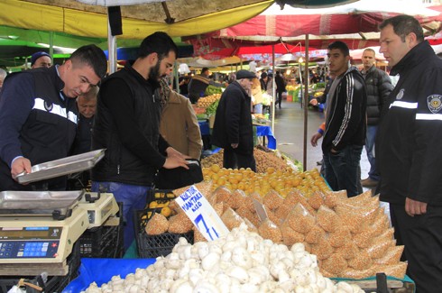 Şirinyer pazarındaki terazilerin ölçü ayar denetimini ve mühürlerinin sağlamlığını denetleyen ekipler, yerleşim yeri işgali yapan esnafa da uyarılarda bulundu