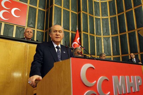 Türk milleti diken üstündeyken Başbakan nerelerdedir. PKK’nın Meclis ayağı BDP, ‘hükümet adım at’ sloganıyla da terör ve bölücülük kalkışmasına yeni bir kılıf bulmuştur. Komşu coğrafyalar kavrulurken, Suriye ve Mısır alev alev yanarken, Türkiye’yi de benzer bir akıbete çekmeye çalışan alçaklar daha inatçı bir şekilde devreye girmiştir” diye konuştu. Başbakan Erdoğan’ın, PKK’nın dirilmesinden ve Türk milletine meydan okumasından birinci derecede sorumlu olduğunu öne süren Bahçeli, karakol yapımına karşı çıkanların aslında Türk devletine ve Türk milletine kin ve nefret duyan bir avuç eşkıyadan başkası olmadığını söyledi.