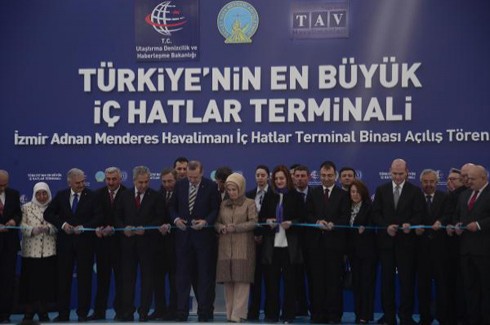 Havalimanı projeleri ve işletmeciliği alanında dünyanın lider kuruluşları arasında olan TAV Grubu tarafından gerçekleştirilen Adnan Menderes Havalimanı yeni iç hatlar terminali, törenle açıldı. Açılışa Başbakan Recep Tayyip Erdoğan, Ulaştırma, Denizcilik ve Haberleşme Bakanı Lütfi Elvan, Başbakan Yardımcısı Bülent Arınç, Ekonomi Bakanı Nihat Zeybekçi, DHMİ Genel Müdürü Orhan Birdal, TAV Havalimanları Yönetim Kurulu Başkanı Hamdi Akın ve TAV Havalimanları İcra Kurulu Başkanı Sani Şener’in yanı sıra çok sayıda milletvekili, bürokrat ve siyasetçi katıldı. Başbakan Erdoğan törenin başında cep telefonuyla uzun süre uğraştı. Mesaj geçmeye çalıştığı sanılan Başbakan’a bir görevli yardımcı oldu.