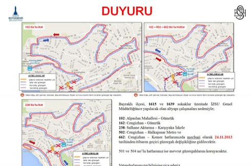 Bayraklı ilçesinde 1615 ve 1639 sokaklar üzerinde İZSU Genel Müdürlüğü tarafından gerçekleştirilecek altyapı çalışmaları nedeniyle bölgeden geçen bazı otobüs hatlarının güzergahlarında geçici olarak değişiklik yapıldı.