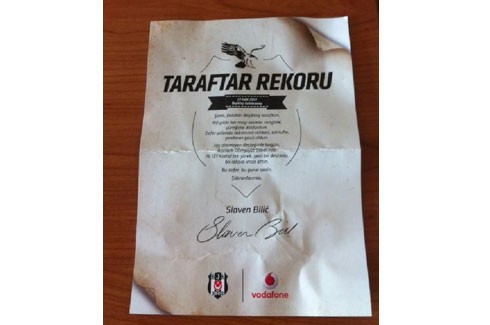 Slaven Bilic imzalı notlarda şu ifadeler yer aldı. "Şanlı, fedakar Beşiktaş taraftarı, 110 yıldır her maçı sesinle, yüreğinle doldurdun. Zafer yolunda takımının rehberi, asi ruhu, yenilmez gücü oldun. Hiç dinmeyen desteğinle bugün, Atatürk Olimpiyat Stadı'nda 76.127 Kartal tek yürek, yeni bir destana, bir rekora imza attın. Bu zafer, bu gurur senin. Şükranlarımla."