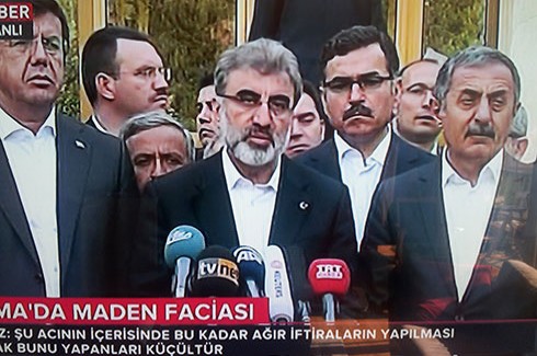 Soma'da 301 madencinin yaşamını yitirdiği Eynez bölgesinde Soma Holding'e ait madendeki arama kurtarma çalışmalarının sonunda Enerji ve Tabii Kaynaklar Bakanı Taner Yıldız, basın toplantısı yaptı.