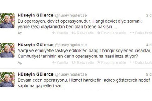İstanbul ve Ankara'da yapılan yolsuzluk operasyonu gündeme bomba gibi düştü. Operasyon kapsamında birçok işadamı ve bazı bakan çocukları gözaltında. Operasyonun nedeninin 'iktidar ve cemaat' arasındaki çekişmeye dayandırılmasına Cemaate yakın bir isimden açıklama geldi. Cemaatin önemli isimlerinden Hüseyin Gülerce, Twitter hesabı üzerinden yaptığı açıklamada, operasyonun 'bir devlet operasyonu olduğunu ve cemaati kullanarak hedef saptırılmaya çalışıldığını belirtti.