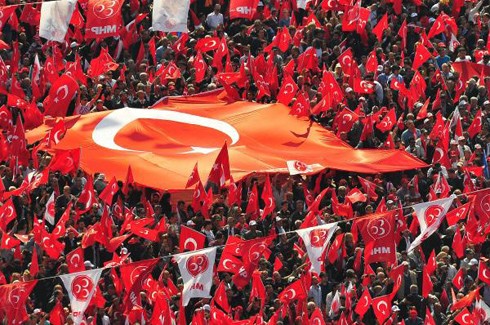 MHP’nin İzmir’de düzenlediği ’Bayrak Mitingi’, yoğun katılımla gerçekleşti. Binlerce İzmirli, Türk bayraklarıyla Gündoğdu Meydanı’nı doldurdu. Alanı dolduran kalabalığa teşekkür ettikten sonra konuşan Bahçeli, çözüm süreci ve hükümeti sert sözlerle eleştirdi. Sürecin Türkiye ve Türk milletini bölmeye yönelik bir kandırmaca olduğunu savunan Bahçeli, "Bölünmeye, yıkılmaya, dağılmaya ve ufalanmaya direneceğiz. Bölücülüğe, hainliğe ve yabancı hayranlarına dik duracağız. Teröristlerin masum gösterilmesine, İmralı canisinin affına, militanların siyasete taşınmasına sonuna kadar dimdik tavır göstereceğiz" diye konuştu.