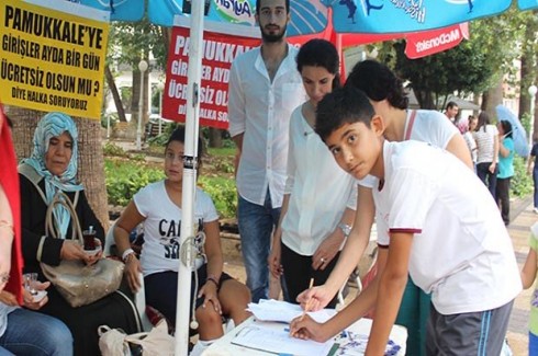 Efes Denizli Turizm Elçileri Derneği üyeleri 'Pamukkale Ayda Bir Gün Ücretsiz Olsun' imza kampanyası başlattı.