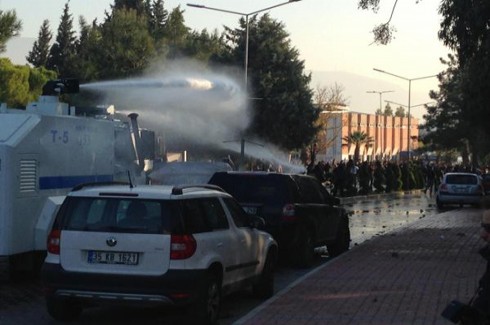 Bugün öğlen saatlerinde, iddiaya göre, aralarında Ülkü Ocakları üyelerinin de bulunduğu bir grup öğrenci kampüsteki Gıda Mühendisliği Fakültesi önünde toplanıp basın açıkması yapacaklarını söyleyerek yürüyüşe geçti. Edebiyat Fakültesi önünde toplanan karşıt görüşteki öğrencilerle diğer grubun karşılaşmasını istemeyen polis ekipleri, TOMA’larla araya girdi. Yürüyüşlerini kampüs dışına taşıyan grup, Ege Üniversitesi Rektörlüğü’ne kadar gitti, buradaki basın açıklamasının ardından dağıldı. Bu sırada, Edebiyat Fakültesi önünde bekleyişlerini sürdüren sol görüşlü öğrenci grubu ise önlem alan Çevik Kuvvet ekiplerini taşlamaya başladı. Gruptakiler, sapanlarla polislere ve TOMA’lara taş atarken, yola barikat kurdu, bazı park halindeki araçları ters çevirdi, masa ve sandalyeleri de ateşe verdi. Polis, TOMA’larla tazyikli su sıkıp grubu dağıtmaya çalıştı. Bazı öğrencilerin çöp kutusu demirleri ve sopalarla TOMA’lara vurup, zarar vermeye çalıştıkları görüldü.