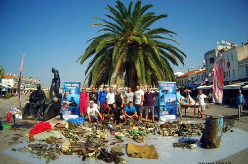 Foça Demokrasi Meydanı’yla restoran ve kafelerin yoğun olarak yer aldığı Küçükdeniz Limanı sularına tüplü dalış yapan dalgıçlar, deniz dibi temizliği yaptı. Dalgıçlar 1 saat içinde denizden cam şişe, eski halı, yağ pompası, bayrak, çıpa, büyük kazan, tüpgaz hortumları, otomobil lastiği, plastik bidon, tencere, tava gibi mutfak eşyaları, meyve ve balık kasaları çıkardı. Çıkarılan atıklardan çok daha fazlasının denizin dibinde olduğunu belirten Foça Dalış Merkezi eğitmenlerinden Aydın Aykut “Denizden çıkarılan atıkları bir süre meydanda sergileyeceğiz. Atıkları görenler belki denizimizi kirletmekten vazgeçer" dedi.