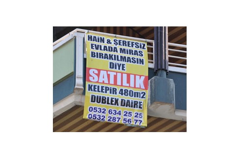 800 bin liraya satılığa çıkarılan dairenin balkonuna ilginç bir satılık afişi asıldı. Üzerinde 'Hain ve şerefsiz evlada miras bırakılmasın diye satılık kelepir 480 metrekare dubleks daire' yazılı afişi gören vatandaşlar, şaşkınlıklarını gizleyemedi. Yoldan geçen vatandaşlar, gördükleri ilginç afişi cep telefonlarının kamerasıyla görüntüledi.