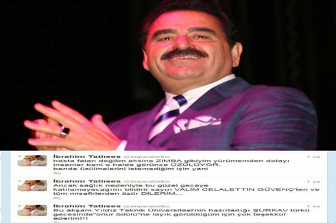 Yeniden twitter’a dönen Tatlıses, “Bu akşam Yıldız Teknik Üniversitesi’nin hazırladığı ŞURKAV türkü gecesinde onur ödülüne layık görüldüğüm için çok teşekkür ederim!!! Ancak sağlık nedeniyle bu güzel geceye katılamayacağımı bildirir Sayın Valim Celalettin Güvenç’ten ve tüm misafirlerden özür dilerim” ifadelerini kullandı.