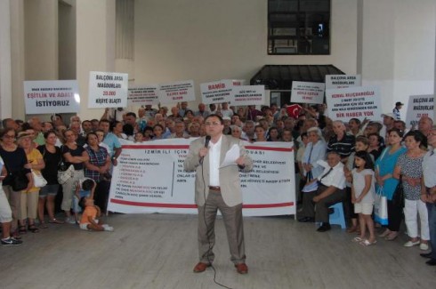 Balçova Arsa Mağdurları Derneği üyeleri, arazilerine istedikleri imar hakkının verilmemesine tepki olarak "İmar dualı" eylem yaptı. Arsa mağdurları, kendilerine komşu başka arsalara verilen imar haklarının kendilerine de verilmesi için dua etti.