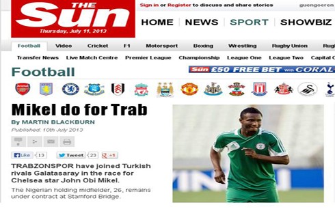 “Chelsea’nin yıldızı John Obi Mikel yarışında Trabzonspor da Galatasaray’a katıldı” ifadelerini kullanan gazete, Galatasaray’ın geçen ay Mikel için transfer girişiminde bulunduğunu, şimdi de Trabzonspor’un bir transfer hamlesi yapmaya hazırlandığını iddia etti. Ayrıca 7 yıldır Chelsea forması giyen 26 yaşındaki oyuncunun, Jose Mourinho geldikten sonra takımda geleceği hakkında endişeli olduğu da belirtildi.