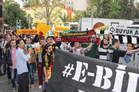 "E-bilete hayır, fişlenmek istemiyoruz tek yumruk, rantınız batsın" gibi pankartlarla yürüyüşe katılan taraftarlar adına bir açıklama yapan Taraftar Hakları Derneği şu ifadelere yer verdi: