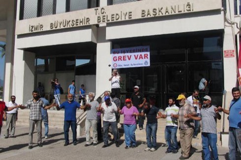 İzmir Büyükşehir Belediyesi’nde bağlı şirket İZENERJİ’de 4 bin işçinin sabah çıktığı grev, Yüksek Hakem Kurulu’nun ortalama yüzde 12’lik maaş zammı kararıyla sona erdi. İşçiler sabahtan bu yana bekledikleri Büyükşehir Belediyesi önünden ayrıldı. Yüksek Hakem Kurulu’nun 6 bin işçiyi ilgilendiren Büyükşehir Belediyesi şirketi İZELMAN’da toplu sözleşmeyle ilgili karar alması üzerine Genel-İş Sendikası bu şirkette bu sabah başlayacağını duyurduğu grevi yapamadı. Ancak İZENERJİ şirketi personelinin grev yasağı olmayan belediye birimlerİnde çalışan 3 bin 500’ü greve çıktı.