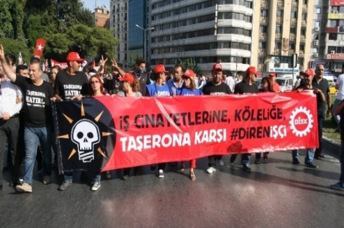 Yaklaşık 5 bin işçi, daha sonra Basmane Meydanı'ndan Gündoğdu Meydanı'na kadar yürüdü. İşçiler, sık sık, 'Taşerona hayır', 'Taşerona geçit vermeyeceğiz', 'Susma haykır taşerona başkaldır' sloganları attı.