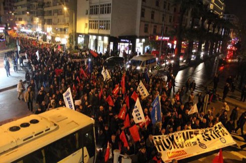 AK Parti Konak İlçe Binası'nın bulunduğu Basmane Meydanı'na doğru yürümeye başlayan grup hükümetin istifasını isteyen sloganlar attı. Grup adına açıklama yapan Ferdan Çiftçi, "11 yıldır tek başına iktidar olan AKP'nin yıllardır adım adım inşa ettiği yolsuzluk ve rant düzeni bugün daha net görülmektedir. Yaşanan istifalar, kabine değişikliğine olanak sağlamak ve AKP iktidarının vitrin ömrünü uzatmaktan başka bir şey değildir" dedi.