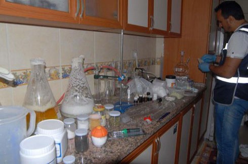 Evin odalarında ve mutfağındaki araştırmalar sırasında karşılaşılan manzara, narkotik polislerini bile şaşkına çevirdi. A.T.’nin, mutfakta deney tüpleri içerisinde kimyasal maddeleri birleştirdiği belirlendi. Zehir tacirinin, ardından da bu kimyasallardan talebe göre uyuşturucu haplar, bonzai uyuşturucu ile cinsel gücü arttırıcı haplar ürettiği saptandı. Daha sonra elle ettiği bu uyuşturucuları da yine kendi elindeki aletlerle hap boyutuna ve gramajına getirip bağlantı kurduğu kişiler aracılığıyla piyasaya sürdüğü tespit edildi. Şüphelinin polise verdiği ifadesinde ise bu uyuşturucu hapları yapmayı kendi imkanlarıyla öğrendiğini ve kimyasal maddeleri de yine kendi belirlediği miktarlarda karıştırdığını söylediği öğrenildi. Kimyasal maddelerden adeta ölüm hapları üreten A.T.’nin, polise ayrıca sahte içki üretimi de yaptığını söylediği, ancak evde bununla ilgili malzemelere rastlanmadığı belirtildi. Gözaltına alınan A.T. ile suç ortağının sorgusunun devam ettiği, evdeki malzemelere de incelenmek üzere el konulduğu bildirildi.