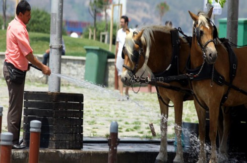 Sıcak hava sadece sokakta yaşayan kedileri değil, gün boyu kızgın asfalt üzerinde yolcu taşıyan faytonlardaki atları da etkiliyor. Fayton sürücüleri, duraklarında atların ayaklarına hortumla su tutarak onları serinletmeye çalışıyor.