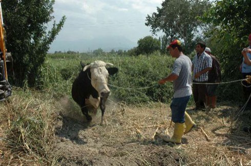 Olayı gören ineğin sahibi Halis Ersoy da, hemen ineğin ardından su kanalının yanına inerek itfaiye ekiplerinden yardım istenmesini istedi. Halis Ersoy’un yakınları durumu itfaiye ekiplerine bildirirken, kısa sürede olay yerine gelen Denizli Belediyesi İtfaiye ekipleri, ineğin hamile olmasından dolayı ineği halata bağlayarak kurtarmak istemedi. Bunun üzerine olay yerine iş makinesi çağrıldı. Olay yerine gelen iş makinesi ineğin düştüğü çukurdan kurtarmak için alanı düzlemeye çalıştı. İneğin çıkacağı kadar bir eğim bırakan iş makinesine, ineğin boynuzuna bağlanan ip bağlandı. Daha sonra sahibi Halis Ersoy, yukarı çıkarken, hamile inek de sahibini takip ederek güçlükle yukarı çıktı.