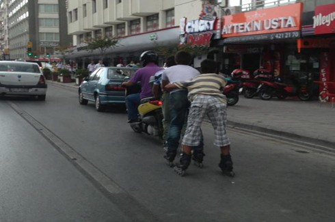 Bir motosikletin arkasına asılan üç gencin, birbirlerinin bellerinden tutup patenleriyle yol alması, görenleri şaşkına çevirdi. Cumhuriyet Meydanı’na ilerleyen bir motosikletin arkasına asılan bir gencin, ona tutunan ve yine birbirlerinin bellerinden tutan iki arkadaşıyla patenle yolda ilerlemesi, şaşkınlık verdi.