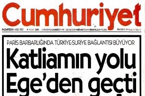 Paris'teki terör saldırısı uluslararası boyutta bütün yönleriyle ele alınıyor,teröristlerin Belçika'da plan yaptıkları şüphesi ağırlık kazanıyor. Buna rağmen Türkiye'yi de ısrarla işin içine sokup suçlama gayretleri de var... Başka ülkelerden değil Türkiye'nin içinden... Cumhuriyet ve Sözcü gazeteleri, Erdoğan nefretlerini artık Türkiye Cumhuriyeti nefretine dönüştürmüş durumdalar. İki gazetede "ülkelerinden nefret eder hale geldiklerini" attıkları başlıklarla ortaya koydular...